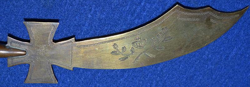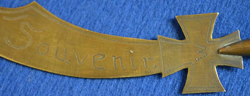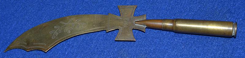 The handle is made from a brass riffle cartridge and the blade and iron cross designed crossguard from scrap brass. The blade is engraved Souvenir with floral decoration and a Prussian crown, the iron cross crossguard is engraved W and date 1918. Interesting item which would look nice displayed on a collectors desk. Exc++
