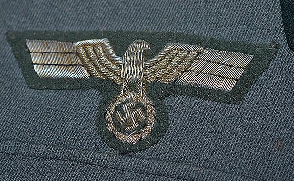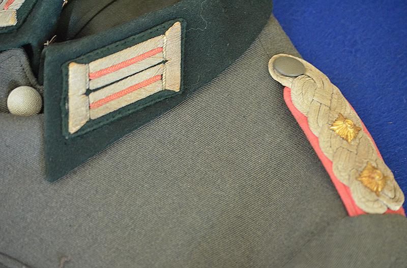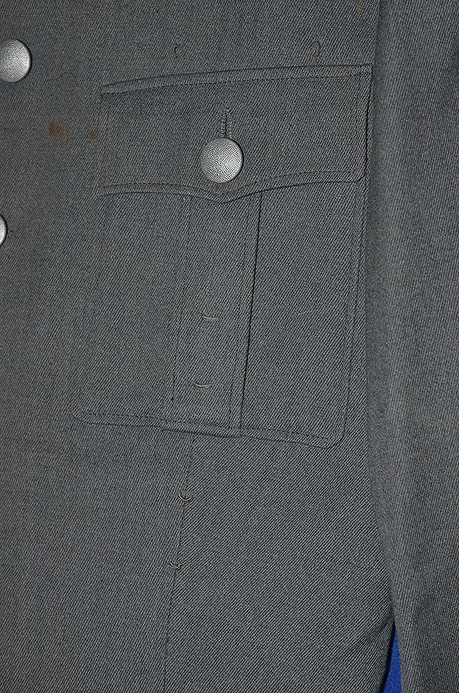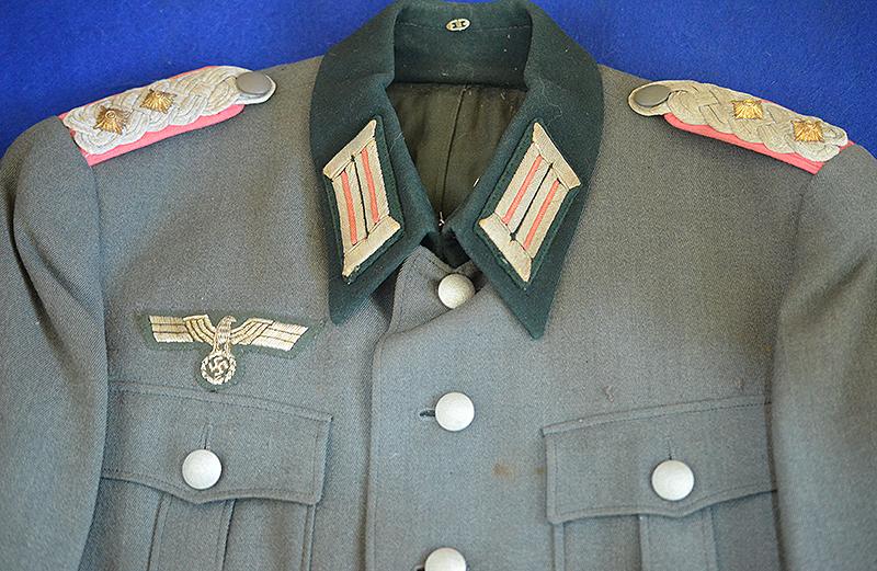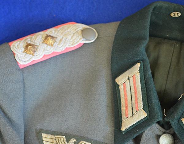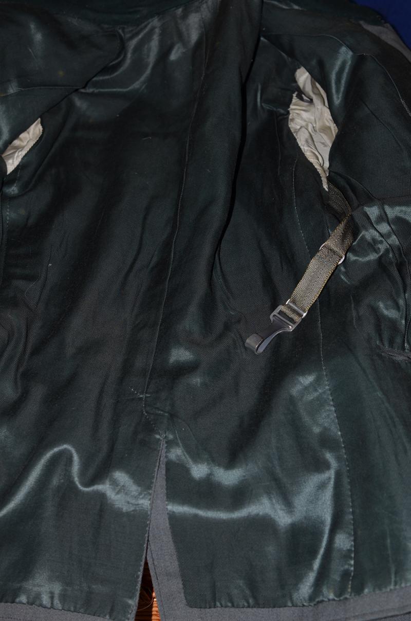 This is a very high ranking tunic probably belonging the the commander of a Panzer Regiment. Four pocket M36 model field grey tunic with dark green collar. Six button front complete with pink piped silver bullion collar patches for Panzer troops, pink piped officers shoulder straps for the rank of Colonel and each complete with two gilt metal rank pips. Fine quality silver bullion breast eagle. Loops on tunic for ribbon bar and two awards. The interior of the tunic features grey silk lining and hanger with metal clip for dagger or sword. The tunic is in really nice condition with no moth damage, there is a tiny stain close to the top button hole which is very minor and might brush out. This is the highest ranking panzer tunic I have owed. Exc++ or better