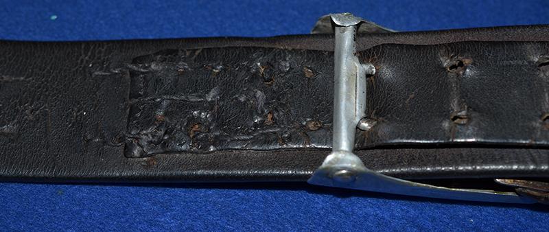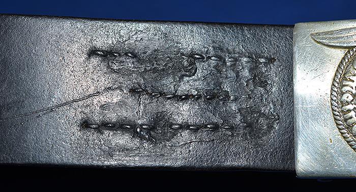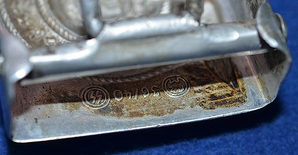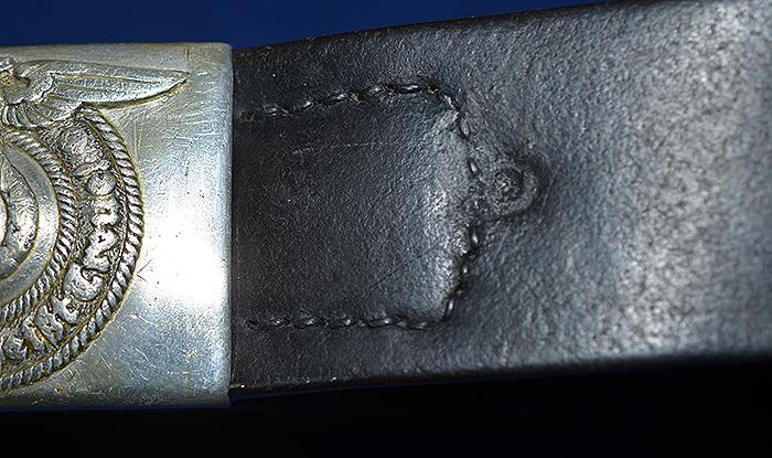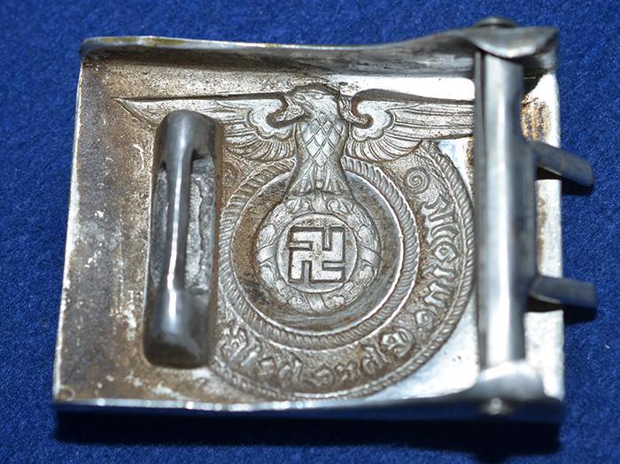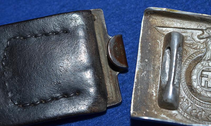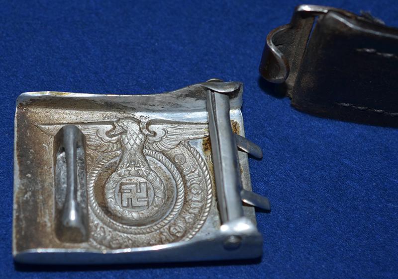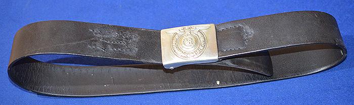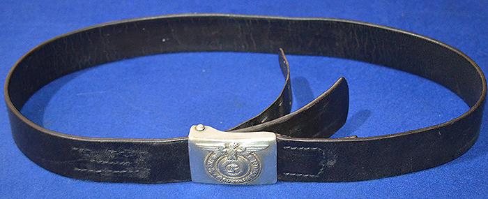 Silver aluminium buckle with excellent detail to the SS eagle and motto showing light wear from age, the reverse is marked, RZM 36/40 SS. Some wear to the black leather belt, the metal retaining clip is marked 1943. A good war time example that has been worn and used. Exc++
