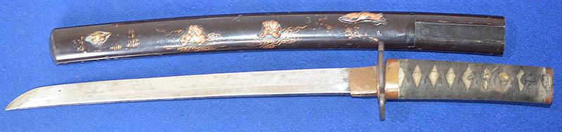 A very nice wakizashi Japanese short sword. Cloth bound fish skin grip fitted with two unusual Manuka. Black iron suba with engraved decoration. The blade shows spotting and age wear but could be cleaned if required. The black lacquered scabbard is decorated with four gilt bronze manuki type figures to each side so eight in total. The scabbard belt fitting and small knife are now missing. Circa 1880