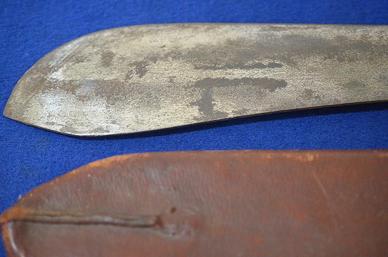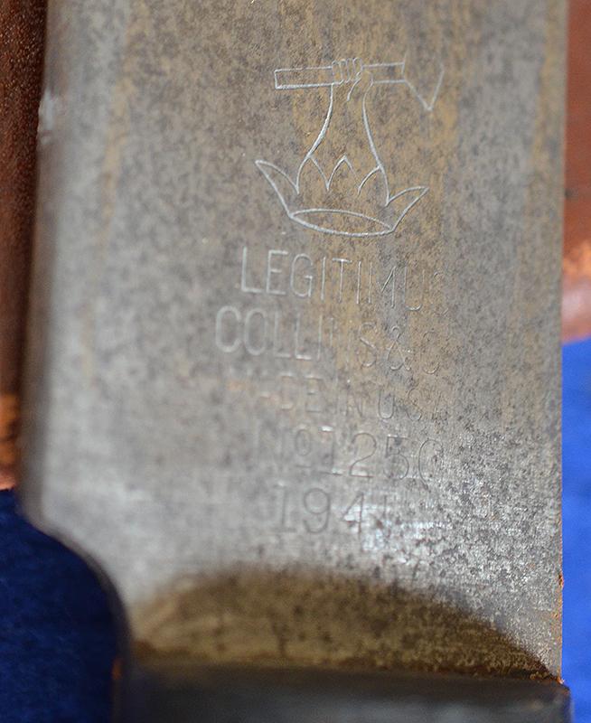 Large machete sidearm. Black grip plates held in place by metal rivets. Impressive bolo type blade shows age and it is maker marked, LEGITIMUS COLLINS& CO MADE IN USA NO1250 1941. Complete with matching brown leather scabbard with grip retaining strap. Exc+