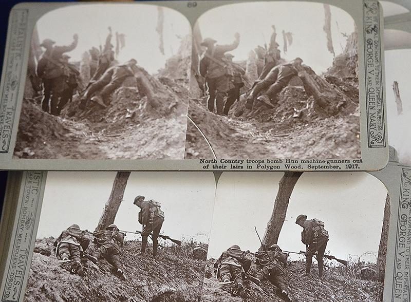 This set contains 26 superb 3D WW1 photographic slides depicting British troops in the trenches on the Western front. The cards are contained in there original card holder that simulates a book with title to the spine. Complete with the original wooden 3D viewer. Fascinating set. Exc++