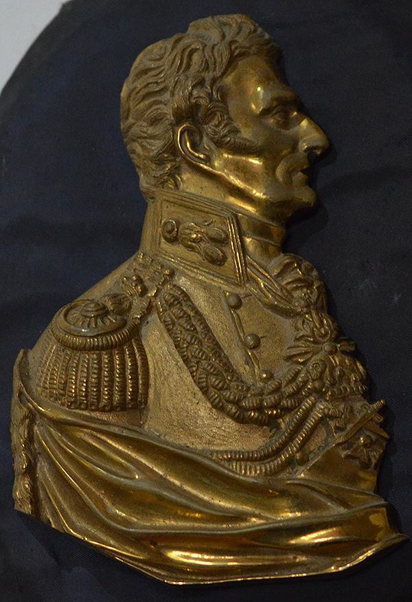 Superb gilt metal wall plaque depicting the head and shoulder of the Duke of Wellington in full military uniform with awards. The figure retains almost all gilt finish. The metal figure is mounted on a black silk covered wooden plaque with wall mounting loop to the reverse side. Height 10 inches or 26cm and very high quality. Exc++.