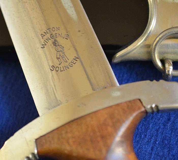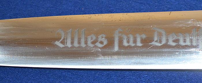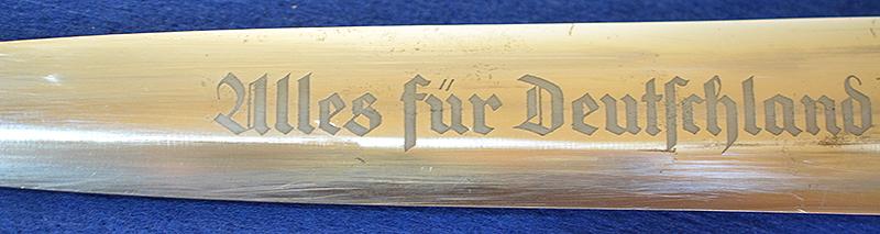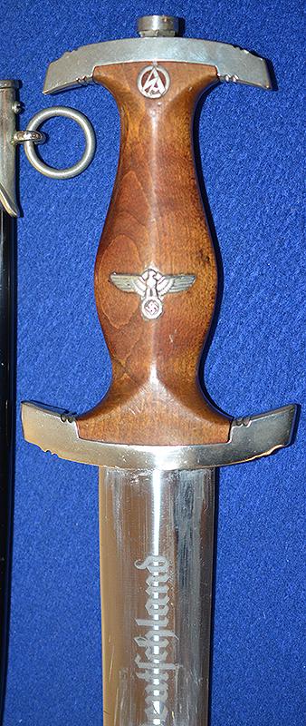 All early nickel silver fittings, the lower crossguard is stamped on the reverse side No which is the district mark for the Nordsea Group. The very attractive brown wooden grip is complete with SA insignia and silver eagle. The blade is in mint condition and it retains all the original crossgrain finish, the obverse side features the Alles Fur Deutschland motto with all factory frosting remaining, the reverse side is maker marked, Anton Wingen Solingen with there knight in armour trade mark. The scabbard would have originally been brown but in 1936 the NSKK were ordered to repaint there scabbards black and that is exactly what this NSKK man did and the paint is still extremely nice, the fittings are matching nickel silver and the lower ball has the typical denting to it but it still looks nice. A good looking example. Exc++
