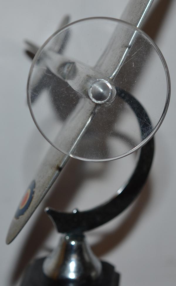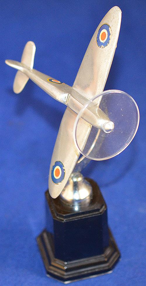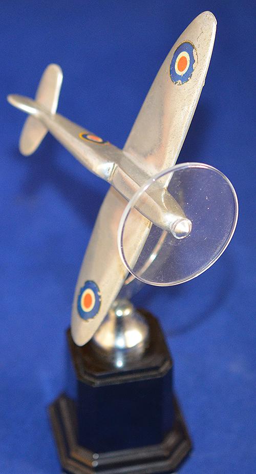 Superb aluminium model of a British RAF spitfire aeroplane which displays RAF roundels. The aeroplane is mounted on a chrome stand and which is then attached to a Bakelite plinth. Height with stand 9 inches or 23cm. Very attractive model which would look great on a collectors desk and far better quality than similar examples that I have seen in the past and which are often cast brass. Exc++