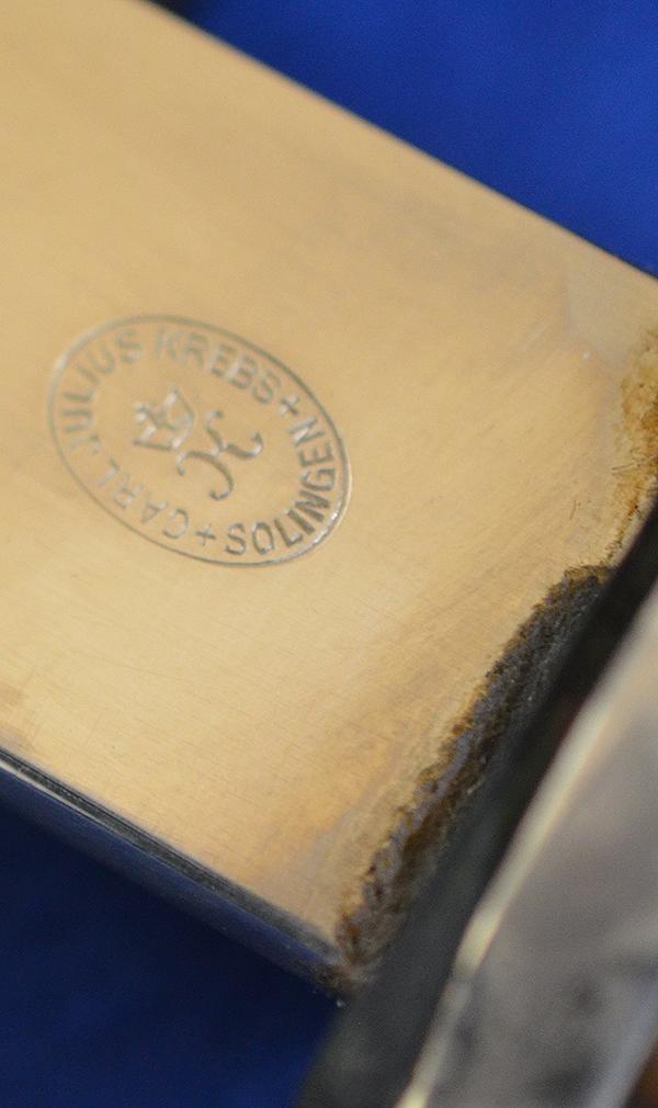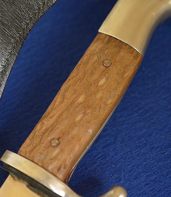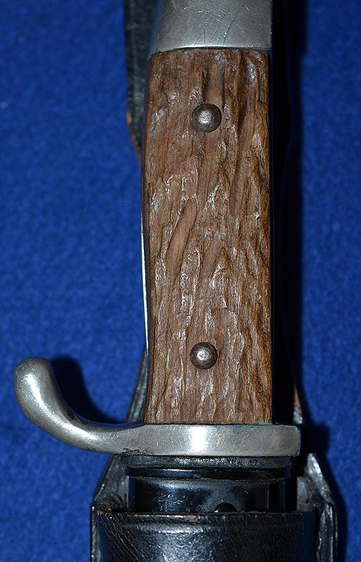 This is an interesting deluxe extra cost example, the grips appear to be staghorn but it is actually carved wood which simulates Staghorn and which are actually harder to find than the genuine staghorn type. The hilt retains all silver plating and the rifle slot is in working order and it is complete with the red factory insert. The beautiful high quality grip plates are in mint condition. The blade is in mint condition and it is maker marked on the reverse side, Carl Julius Krebs Solingen. The scabbard black paint is 99% remaining with just very slight wear under the frog from rubbing over many years. Near mint or better.