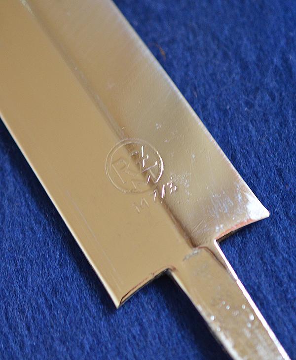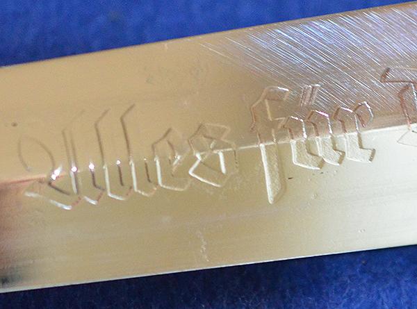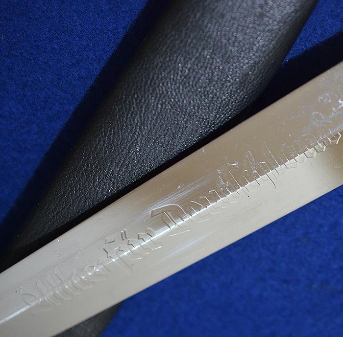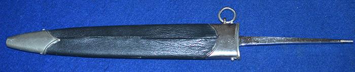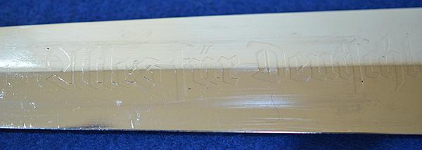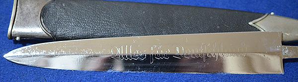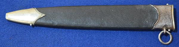 Scabbard and blade for a dagger. The blade features the SA motto to the obverse side, the reverse side is marked, RZM M7/3 which is the makers code for Kuno Ritter Solingen, blade has been chrome plated in the past and is just very slightly short but not by much. The scabbard is fitted with RZM period plated fittings and show some wear, the ball is missing from the bottom mount but could be easily replaced / restored, scabbard has been expertly covered in black leather and all original screws are missing but three of them have been post war replaced. Perfect for a restoration project. Exc.