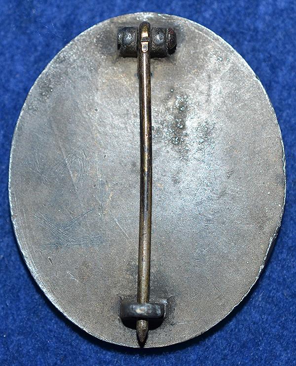 Good detail to the swastika decorated helmet and the crossed swords. The reverse side features pin and hook. Nice example that has been worn. Exc++