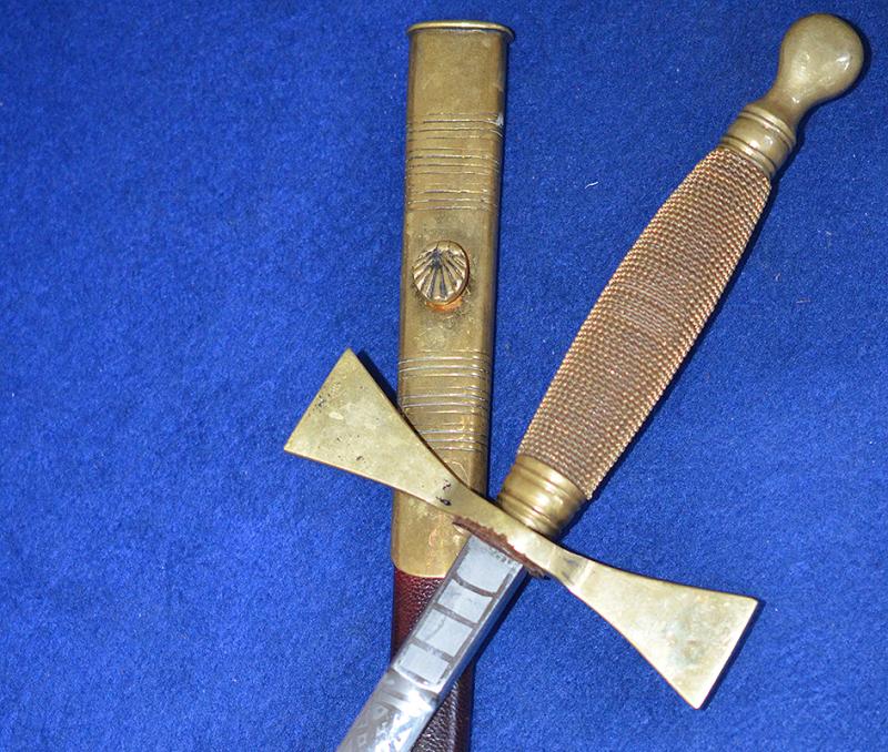 A nice example of a British masonic society dress sword dating to the early 1900's. Brass hilt with wire bound grip. The blade is in mint condition and it is double etched with a floral decoration incorporating the masonic cross design and it is maker marked, Thos.E.Booker & Co Bradford. Complete with leather scabbard with matching brass mounts. Exc++