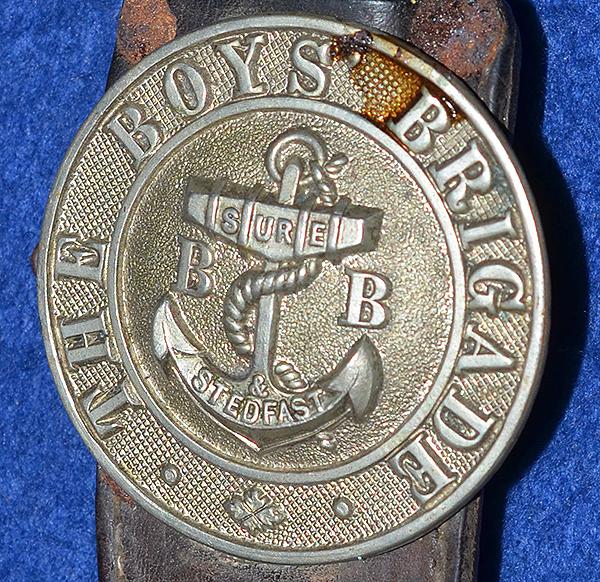 Aluminium pommel. Leather bound grip and simple brass crossguard. The blade is in excellent condition just showing some minor age marks and it is maker marked, FAGAN FOREIGN. Brown leather scabbard mounted with large nickel silver badge marked, THE BOYS BRIGADE with large naval anchor, the scabbard is complete with belt strap and grip retaining loop, the popper button and part of the strap have come away but it is still attached. Exc+