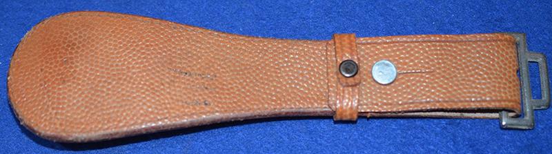 Brown leather sword hanger complete with silver metal spring clip which is in good working order. Near mint.