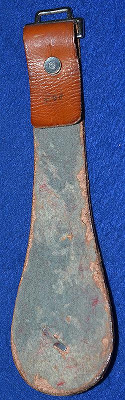 Brown leather hanger with metal spring clip which is in good working order. Field grey backing to the reverse side showing some wear from age. Exc++