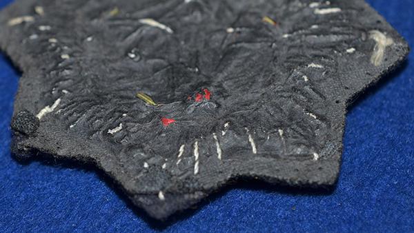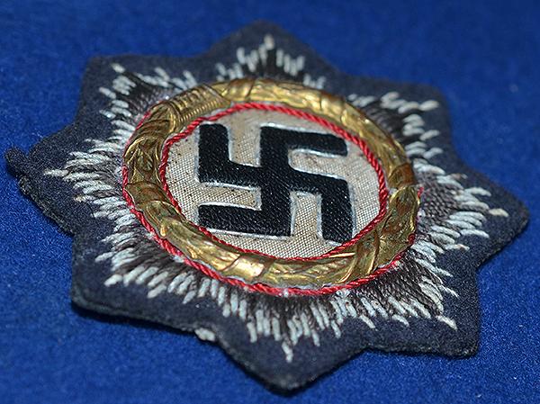 Very nice cloth example of this high military award. The badge still retains almost all gilt finish to the metal wreath with excellent detail to the black woven swastika. Luftwaffe blue backing. The reverse side still retains much of its original paper backing. Removed from a tunic. Exc++