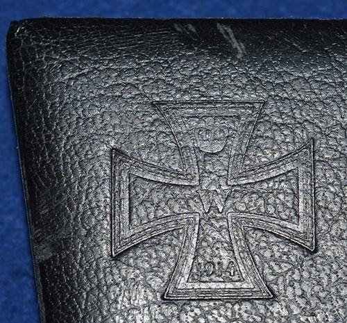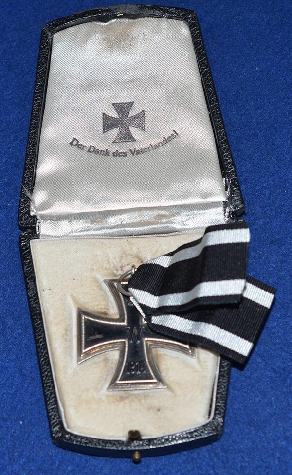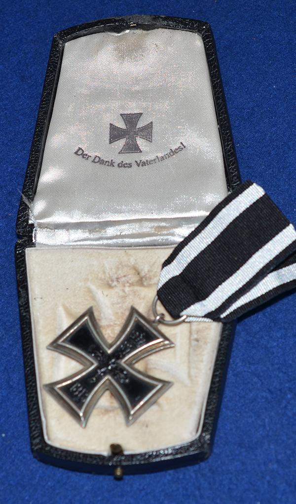 Very nice 2nd class iron cross with ribbon. Complete with scarce black leatherette presentation box of unusual shape, the exterior lid of the box is impressed with the design of the iron cross, the interior base of the box is fitted for the cross and the interior lid features the the iron cross design with patriotic motto below. Exc++