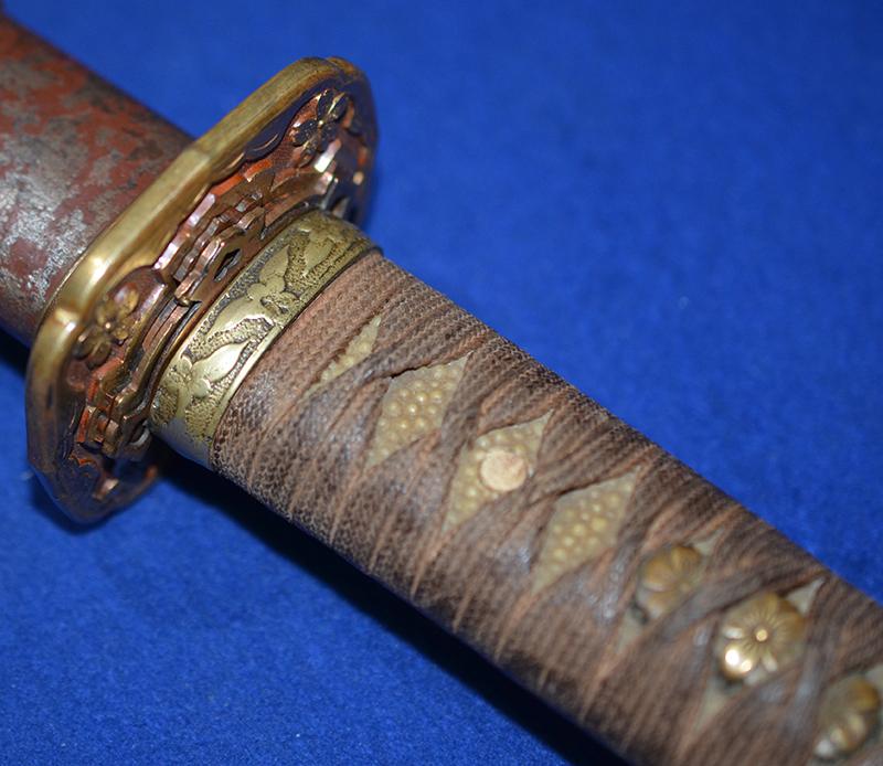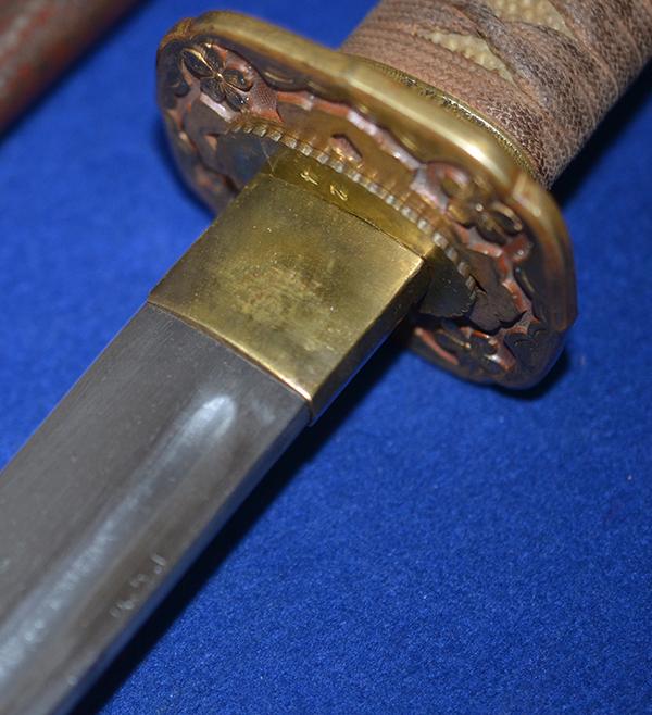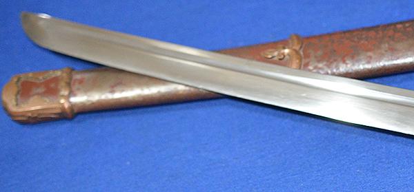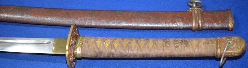 Cloth bound fish skin grip complete with three manuke to each side. Decorative pommel with swivel ring and ornate suba. War time blade with blood fuller shows some age spotting but it is still bright and looks nice. Metal officers scabbard still retains a good percentage of the original brown factory paint. Bargain price. Exc+