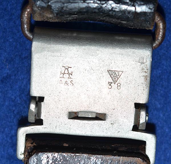 A large black leather bullet type hanger with metal spring clip which is marked on the reverse side RAD in a triangle and 37 and it is also stamped with manufactures A stamp for Assmann and letters A & S. Complete with the rare matching black leather belt loop, the metal clip has matching Assmann stamps and and it is also stamped 38. A really nice set. Exc++
