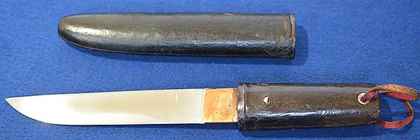 Small Japanese air force pilots Aikuchi dagger. Black leather grip is in excellent condition. The near mint blade measures 6 inches long including the brass Habaki and the blade has a well defined Hamon line. Matching leather covered scabbard. Total length almost 10 inches long. Near mint.