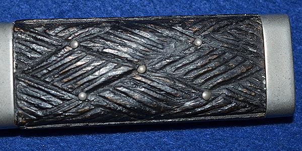 Very attractive carved black wooden grp inset with silver decorative pins. Silver plated hilt mounts. The blade is in excellent condition and it is maker marked, Nowill & Sons Sheffield England. Black leather scabbard with matching silver plated fittings with slight wear to the reverse side of the upper fitting. Size 18 cm long. Exc++