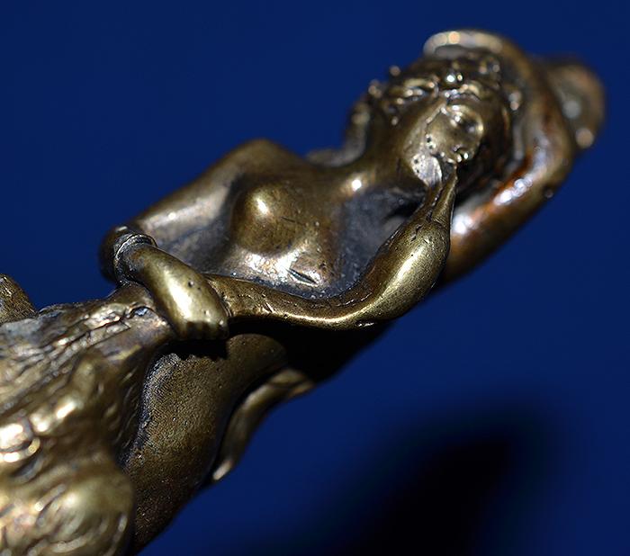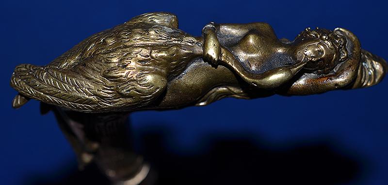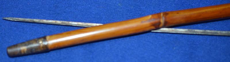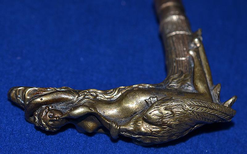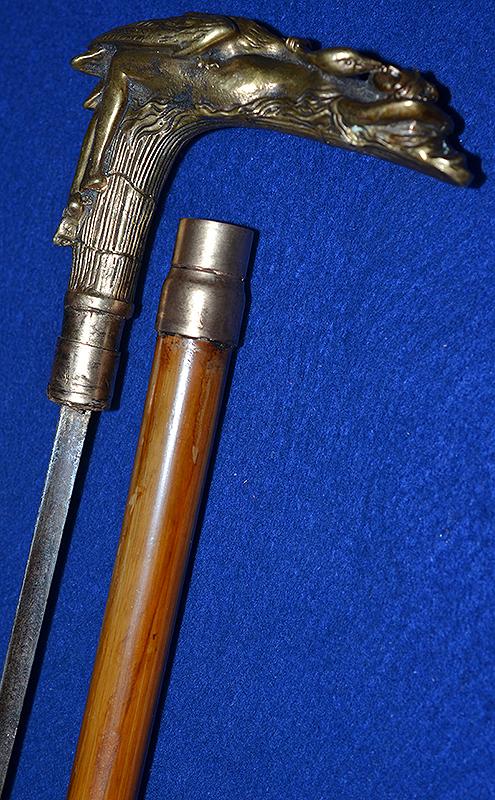 The pommel on this stick is superb quality and it depicts an attractive young lady caressing a large swan. Bamboo stick with brass tip. Pulling the handle away from the stick reveals a long cruciform steel blade. Exc++