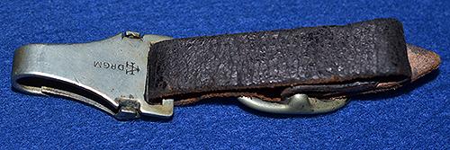 This hanger is correct for the SS or NSKK 33 model dagger. Black leather strap with nickel silver fittings, the spring clip is stamped on the reverse side DRGM with the Assmann makers A mark. Exc++