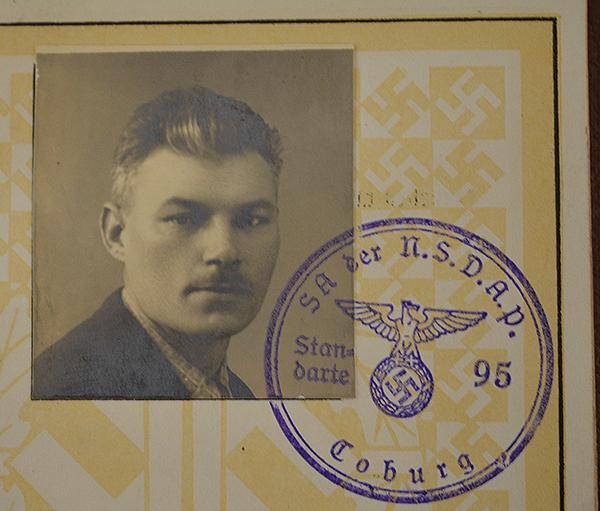 This is an interesting example as the original owner lived at Coburg, this town is historically important as it was the location of Adolf Hitlers first victory outside of Munich against the communists and Reds in 1922. Brown cover with gold title with Sports badge design to the cover. Inside of the book gives the owners details, Albert Hackert, born in 1904 and lived at Coburg with photo of the original owner with official SA issue stamp from SA Standarte 95 which was based at Coburg. The book shows that Hackert was awarded the SA sports badge in bronze on the 28.6.1938. Mint.