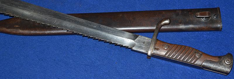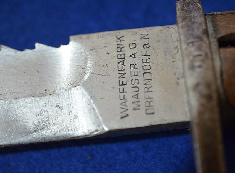 This is the model that is often described as the butcher bayonet because of its massive clever like blade. The wooden grip plates are in perfect condition. Steel hilt fittings are in excellent condition with waffen amp stamp to pommel and the rifle bayonet slot is still in good working order, the reverse side of the crossguard is issue stamped and it appears to be 6 LL. The impressive saw backed blade is maker marked, WAFFENFABRIK MOUSER AG OBFRANDORF AN, the spine is stamped with waffen amp marks. Complete with original scabbard that retains much factory bluing, there are a few shallow dents but nothing significant just age. A nice looking sawback bayonet. Exc++
