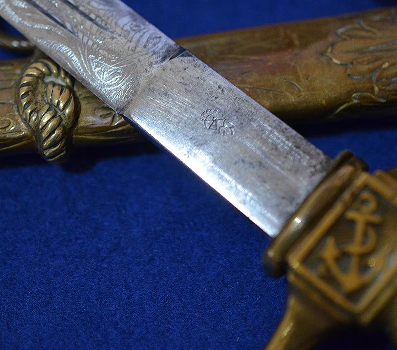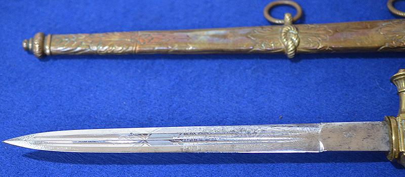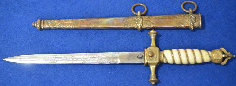IMPERIAL GERMAN NAVAL OFFICERS DAGGER WITH UNUSUAL SCABBARD WHICH IS PERSONALISED TO THE ORIGINAL OWNER.