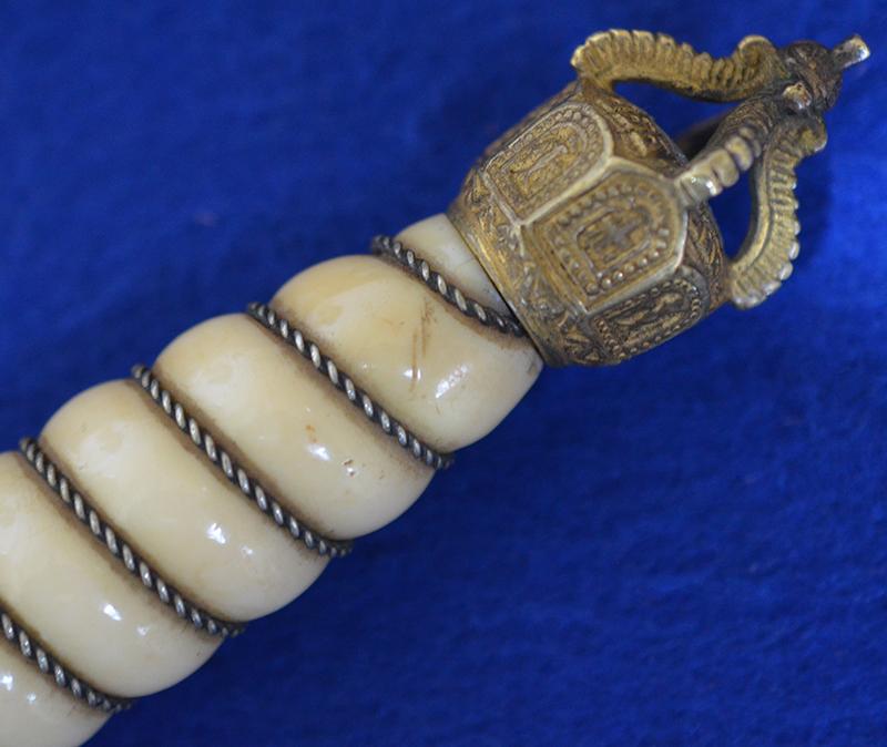 Superb quality open crown imperial pommel, the matching imperial crossguard is also very nice. The white bone grip is in fine condition with tiny scratch to the reverse side just under the pommel but no chips or crack, it is really nice grip. The double etched blade is by WKC and features there small knights head trade mark as used during the imperial period, the blade is double etched with long foliage panels and featuring the sailing ship and crowned anchor design, the blade is still in excellent condition, The matching brass scabbard is beautifully decorated with oakleaves to the upper section, the lower section features lightning bolts and then more oakleaves, the scabbard band are the rope type and the suspension rings are also engraved with a rope design, the reverse side of the scabbard is expertly engraved with the original owners initials. This is a really nice example of an imperial naval officers dagger which are very difficult to find especially when as nice as this one. Exc++