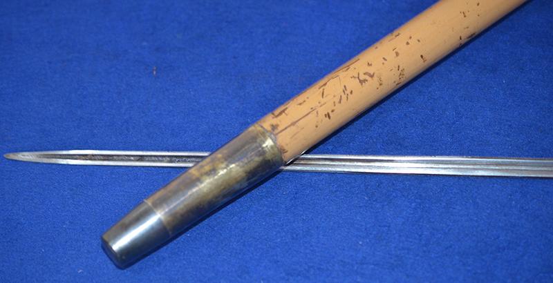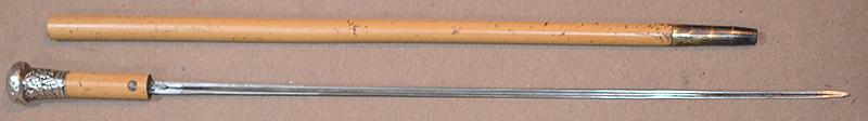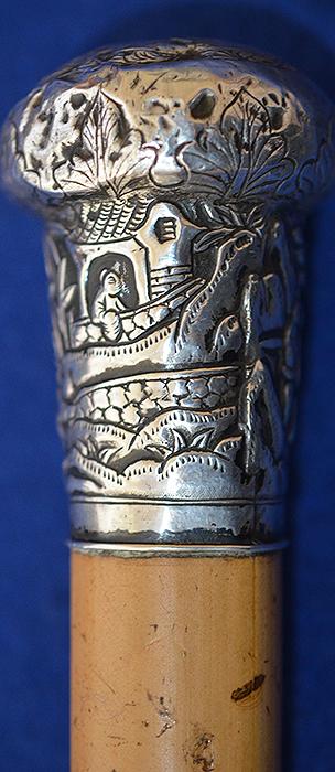 Produced in the European style and dating to about 1900. Very nice malacca wooden cane with silver pommel featuring chines oriental designs, it is not silver marked but it is almost certainly silver. Pressing a button on the upper part of the wooden cane releases the steel blade which is long and very impressive. A high quality sword stick probably carried by a wealthy merchant. Exc++