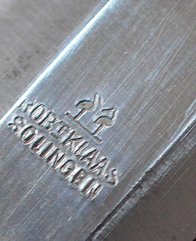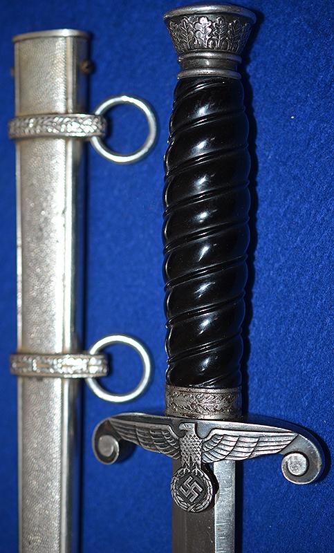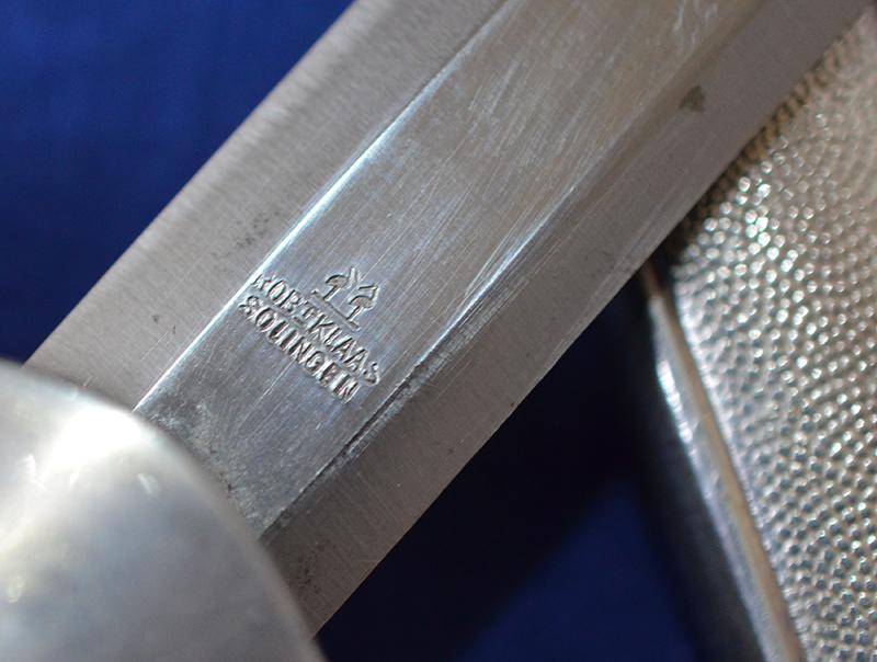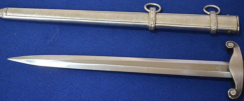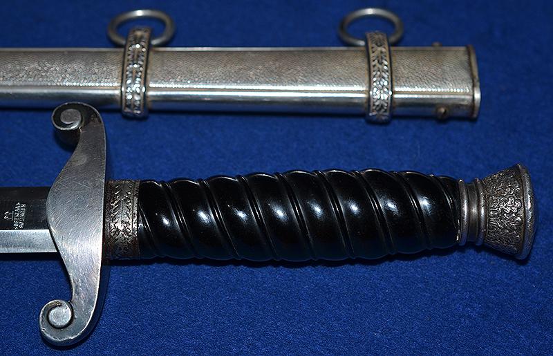 Identical to an army dagger but with a black grip and this is a text book example by Klass with unique features only seen on examples by this maker. Silver plated crossguard and pommel of the Klass type, the black celluloid grip is the desirable extra long type only seen on black grips by this maker. The blade is in mint condition and it is stamped with the makers details, ROBT KLASS SOLINGEN and featuring there kissing Krane's trade mark. The matching silver scabbard is also in fine condition and the scabbard bands have the unique Klass marks to each. A really nice example and a very difficult model to find especially by Klass which is the maker most advanced collectors wish to own. Near mint.