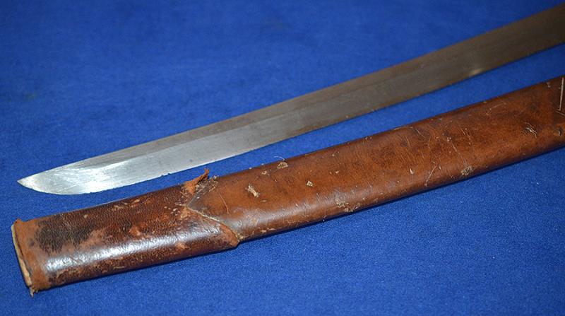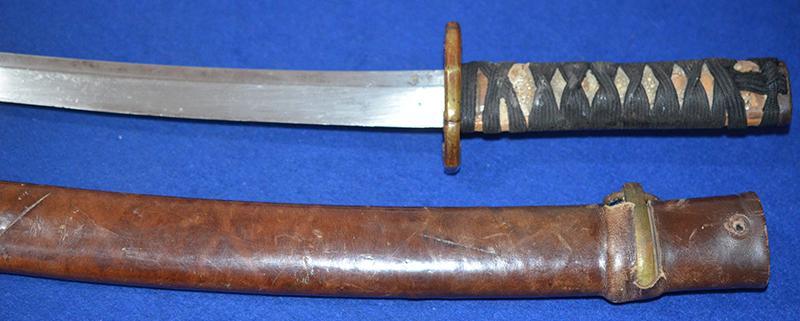 A very nice Japanese officers Katana sword which is shorter than most measuring 31 inches or 78cm long when fitted into its scabbard. Black cloth bound fish skin grip. Ornate brass tsuba. The blade shows some wear with a few tiny nicks to the cutting edge but could be cleaned / restored if required. Complete with scabbard with desirable leather covering. Not mint but priced accordingly and certainly still very collectable and good value. Exc+