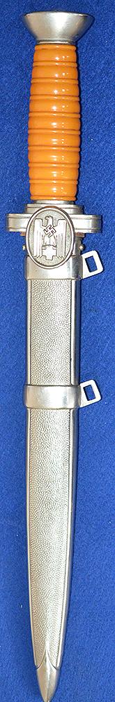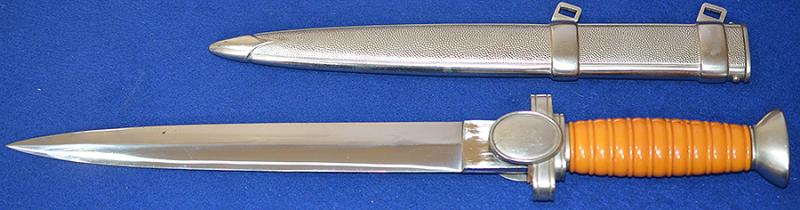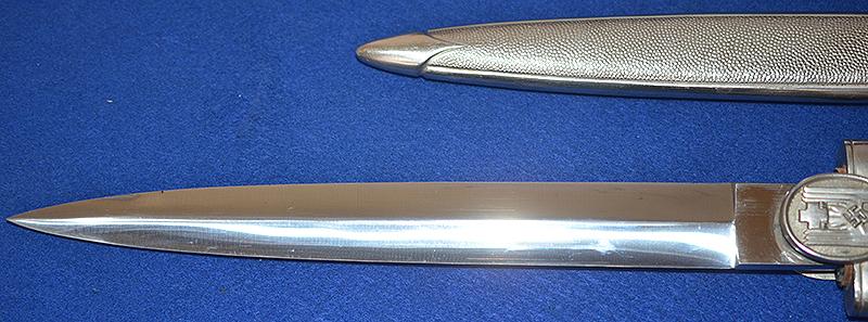 All silver finish remaining to hilt fittings and with fine detail to the red cross eagle and swastika design. Mint orange grip. The blade is in mint condition and it is very impressive. The matching scabbard is also in mint condition. Difficult to improve on this one. Just about mint condition.