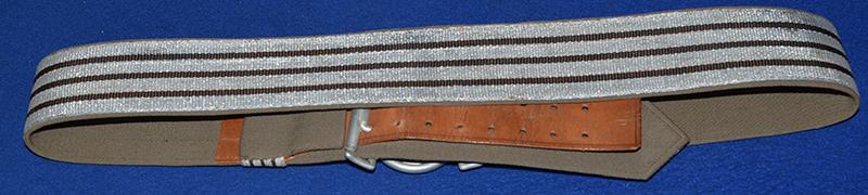 Silver brocade belt with triple brown stripes with brown backing material on the reverse side, complete with brocade belt runners. Circular silver aluminium buckle with the RAD spade with swastika design. The reverse side of the buckle is marked, DRGM 38 and with a large A for the maker Assmann. Mint.