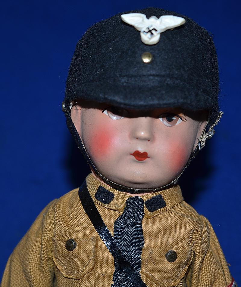A superb pair of Third Reich dolls standing at 12 inches or 30cm each. The male doll is dress as an SS man wearing black kepi with small silver eagle and swastika badge, brown shirt with black collar patches and swastika arm band complete with black belt with swastika buckle and cross strap with black neck tie. Black breeches complete with black jack boots. The female doll is wearing traditional Bavarian costume with black cloth hat, brown dress and ornate apron with red silk belt, she is wearing a metal swastika pendant suspended from her neck. The female doll has a slight bruise to the right side of her face, (she must have been a real street fighter in the battle against the reds in the kampzeitze), the male SS doll is perfect. Exc++