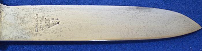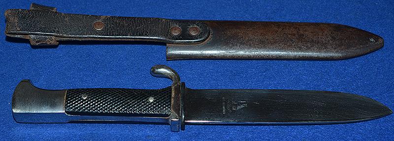 Silver hilt is in perfect condition with no damage at all. The black celluloid grip plates are in perfect condition and it is complete with HJ enamel diamond badge just showing slight wear but no damage. The early style blade features the HJ motto to the obverse side, the reverse side is maker marked, SMF Solingen GFS.GESCHUTZT, SMF is a rare maker to find on HJ knifes, there is some slight age marks to the blade but over all it is still very nice and a lot better than most. Blued anodised scabbard shows some age wear but it is still nice. Complete with black belt loop and grip retaining strap. A very nice example. Exc++