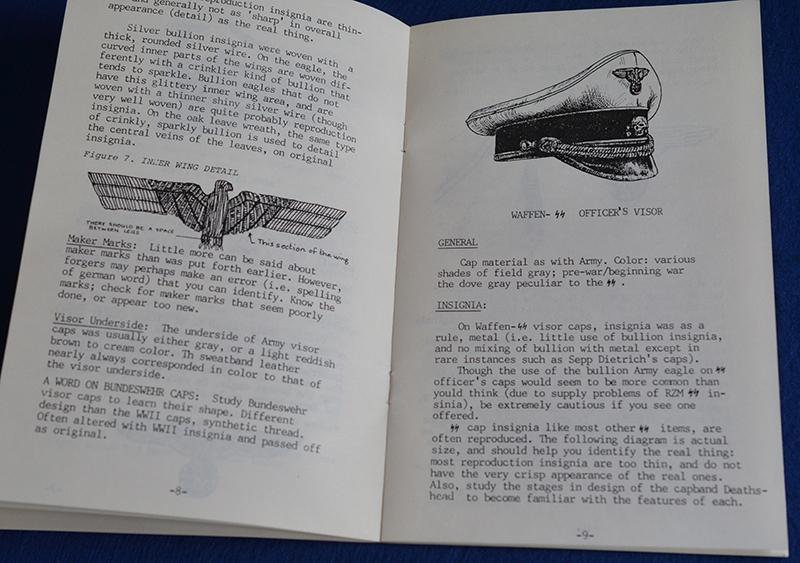 Pocket Guide To the Identification of Reproduction and Altered Original Third Reich Headgear by Gary Wilkins. Long out of print book published in 1986 and containing over 30 pages. Book explains what to look for with reproduction or altered German hats. Near mint.
