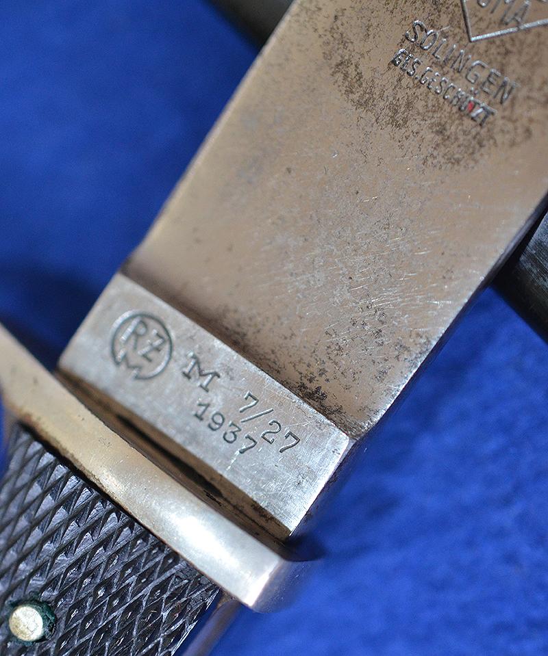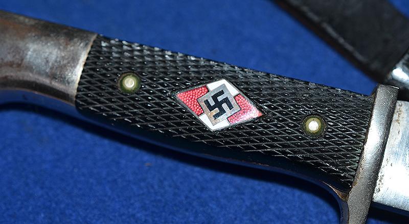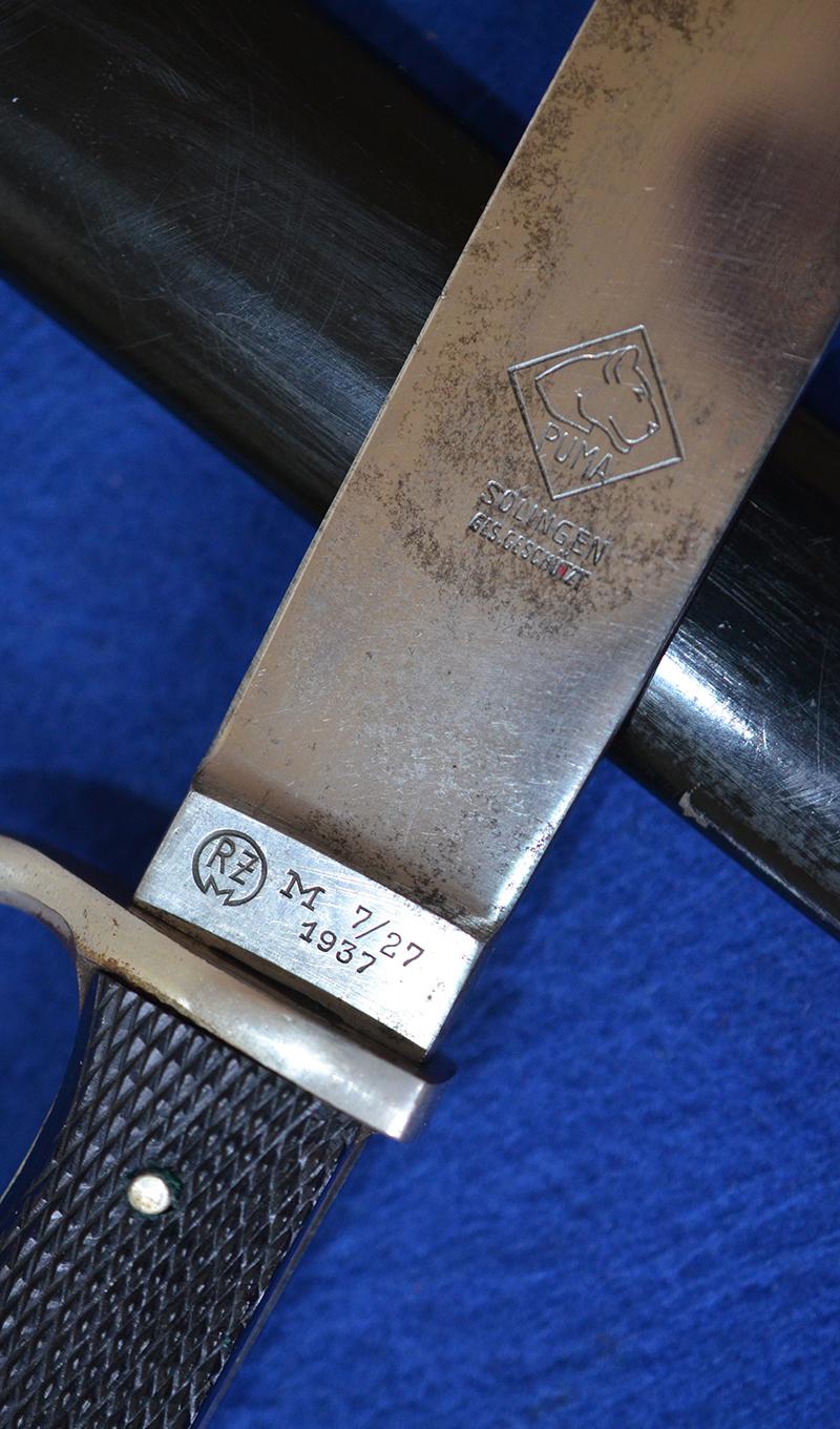 The black celluloid grip plates are in perfect condition, the obverse side is fitted with enamel HJ diamond badge which is in mint condition. The silver plating to the hilt is in perfect condition with just some wear to the pommel from rubbing of the grip strap over many years. The blade features the HJ motto to the obverse side and the reverse side is maker marked, Puma Solingen Ges Gesch with there trade mark of the head of a large cat, the knife is also marked, RZM M73/27 1937, there are a few minor age marks to the blade but over all it is still very nice. Black painted scabbard fitted with black leather belt loop, the grip retaining strap is unusual as it is fitted with a buckle rather than the standard popper button, almost certainly an alteration by the original owner and which is an unusual and interesting feature to see. Exc++