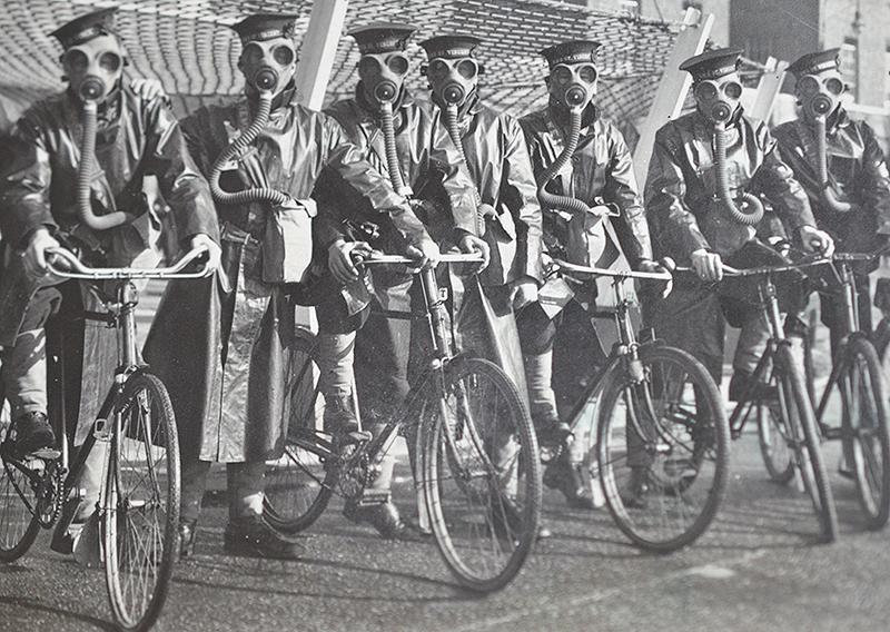A very unusual post card dating to the 1930's that depicts 10 British navel personnel on bicycles all of which are wearing gas masks, they are also wearing naval caps with the cap tally of HMS ST VINCENT. near mint.