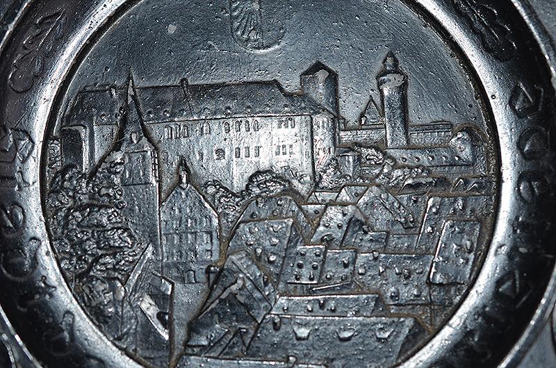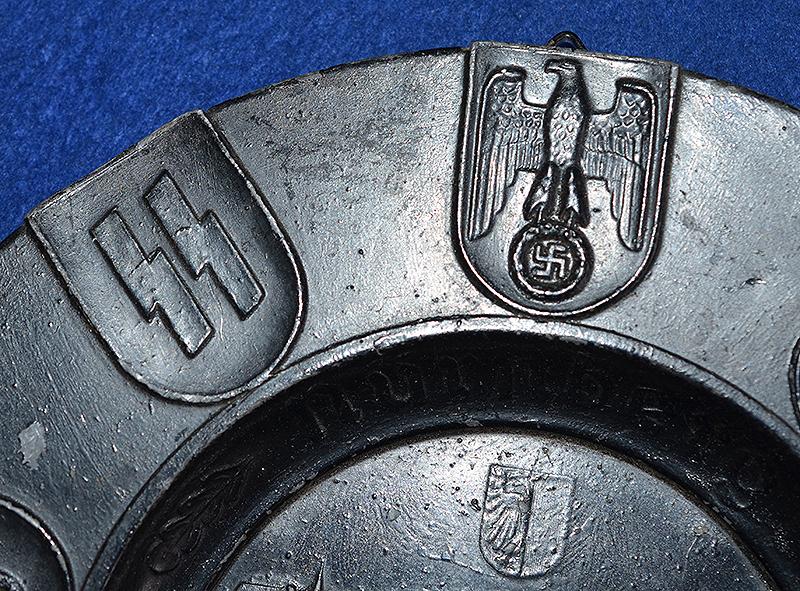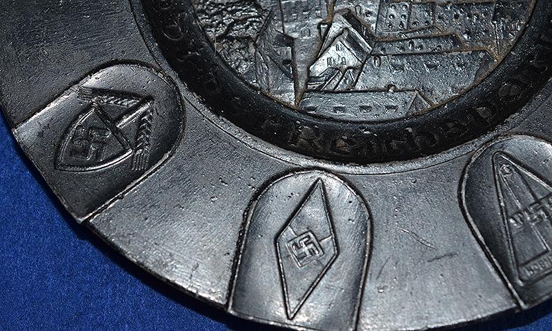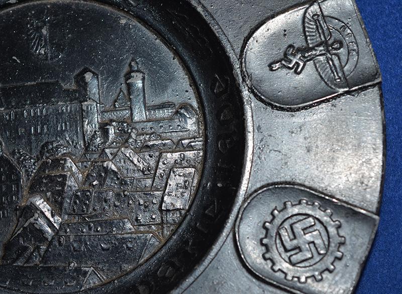 Very attractive factory blackened metal salver with the central design of Nuremberg castle and with the inscription, NURNBERG STADT DER REICHSPARTEITAGE, and the outer edge of the salver displays nine shields bearing the designs of nine organisations of the party and state, STATE EAGLE, SS, SA, NSFK. DAF. FRAUENSCHAFT, HJ. RAD, NSKK. The reverse side features wall hanging loop. These NSDAP Salvers and other similar items were sold at the yearly Nurnberg party rally as commemorative souvenir items. Near mint.