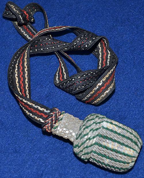 Black cloth strap with double silver strip and single red strip with green and silver acorn. Exc++