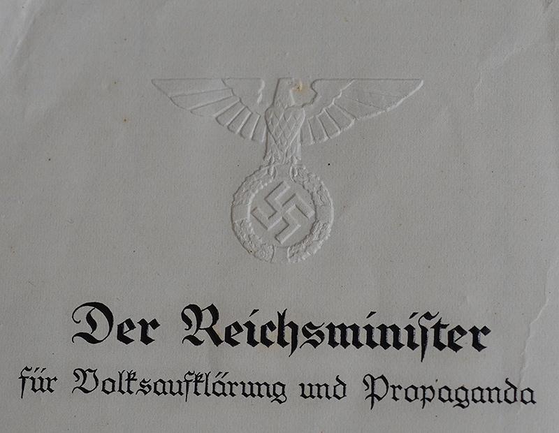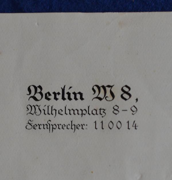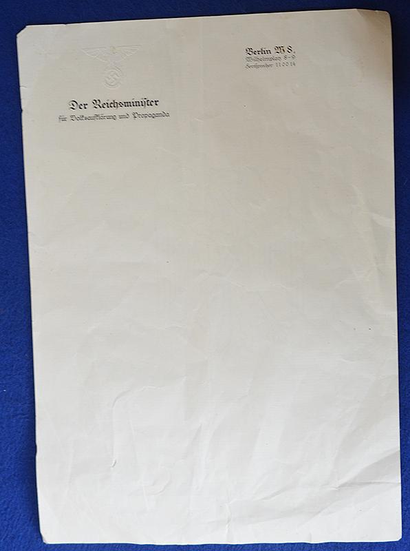 A single sheet of un-used note paper from Dr Goebbes office. White sheet of paper with black printed title and blind embossed state eagle and swastika seal. Der Reichsminister fur Volksauftlarung und Propaganda. Berlin W8 Wilhelmplatz 8-9 Fernsprecher 110014. A very rare letter head to find, it is certainly the first one I have owned to Dr Goebbels as items associated with him are very rare. Exc++