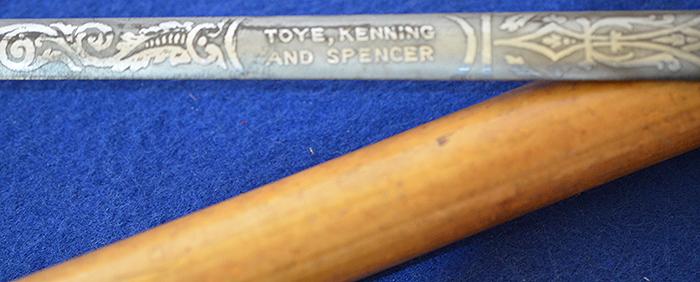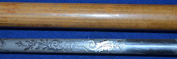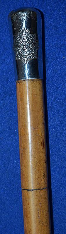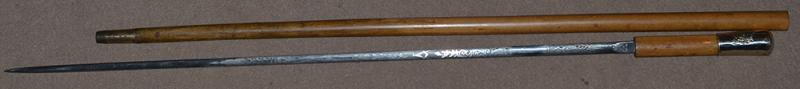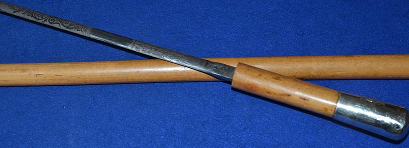 A very nice Edwardian army officers sword stick with malacca wooden cane with silver top and featuring the badge of the, Army Service Corps. Pulling the handle away from the shaft reveals a very nice double edged long steel blade that is double etched with masonic symbols. The owner almost certainly retired from the army and became a Mason. Exc++