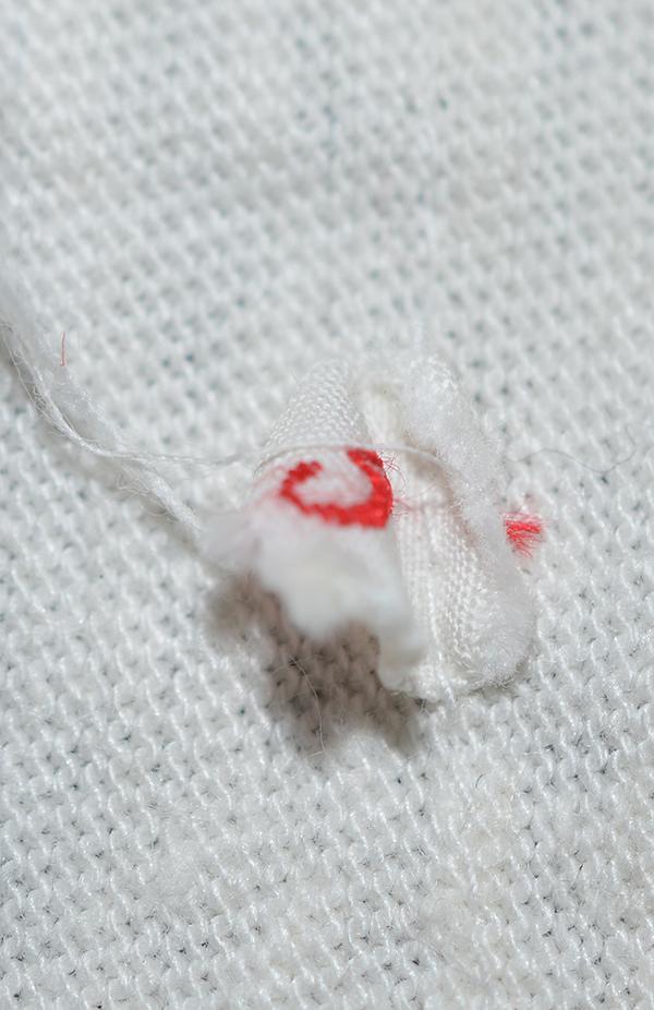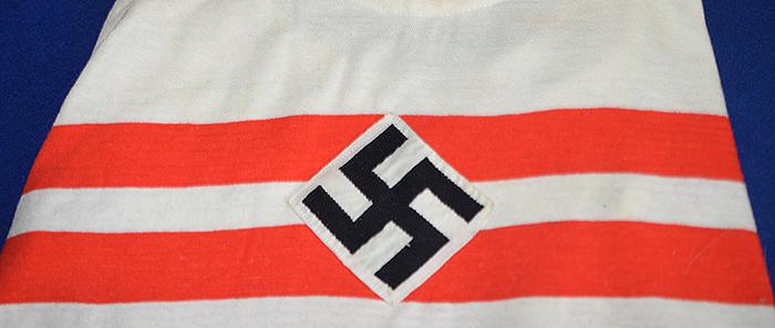 White cotton vest printed with double red strips and with separately applied HJ white diamond with machine embroidered black swastika. Small cloth label to inside marked 5. Near mint.