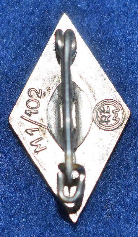 Red and white enamel diamond badge with black swastika. Safety style pin to the reverse side and it is maker marked, RZM M1/102. Near mint.