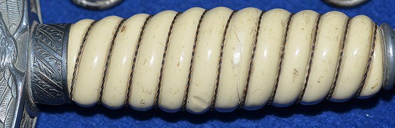 This is a nice example that was purchased privately and it has never been in a collection. Excellent detail to the swastika pommel and eagle crossguard. White celluloid grip is nice but it does have a very small and faint crack to the centre of the grip but it is difficult to see as it runs close to the grip wire and in the same direction. The blade is in very nice condition and it does not have a makers name. Complete with matching scabbard which is in excellent condition. Although the dagger is not maker marked from the style of the fittings the maker is probably WKC. Exc++