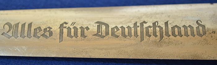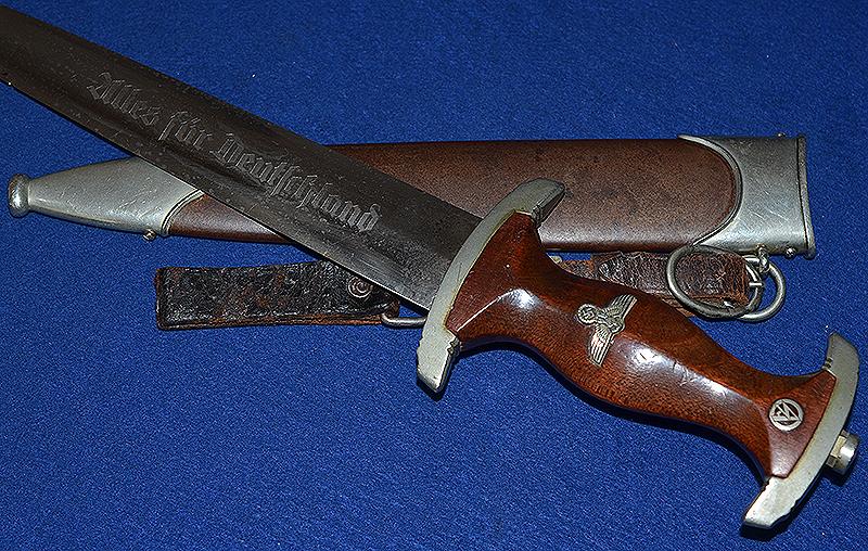 This interesting example features the rare and very desirable and early large oval Eickhorn trade mark. All early nickel silver fittings, the lower crossguard is stamped Wf for the Westfalen SA group and it is also engraved, 16/13877 which is probably for SA Regiment 16 and the owners Ausweise number, the bottom of the crossguard is stamped 9 which is the factory workers bench number which is often seen on very early daggers by Eickhorn. The brown wooden grip is in fine condition and it is complete with SA insignia and silver eagle, it appears that the eagle might have taken a slight bump in its wearing life as the left wing is slightly tilted downwards but this might be just how it was mounted as the grip has a hand finished look to it which often early daggers do. The blade does show some age spotting and one tiny nick to the cutting edge but no pitting just natural age, the obverse side features the SA motto and the reverse side the rare and very early production large Eickhorn oval trade mark, if it was originally a Rohm blade there is no trace of the inscription now. Brown anodised scabbard with matching nickel silver fittings, there is a slight dent to the very bottom of the ball but it is not really noticeable. Complete with SA brown leather hanger and belt loop. Not a mint dagger but a very interesting example being unit marked and very early production. Exc++