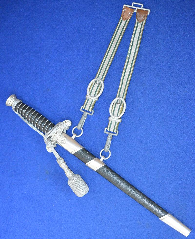 All fittings are the more desirable aluminium type. Fine detail to to pommel and Customs crossguard eagle with up turned wing tips in the customs style. The green leather grip in in mint condition. Near mint blade by Horster Solingen. The scabbard shell is fitted with dark green leather and it is in perfect condition, it is complete with three matching aluminium fittings. Complete with silver knot and a very nice set of Land Customs straps. Most Customs daggers are constructed in a combination of aluminium and steel plated fitting, dagger produced in full aluminium are considerably harder to find and much more desirable and this example is probably the best you will ever find as it is in close to mint condition. Near mint.